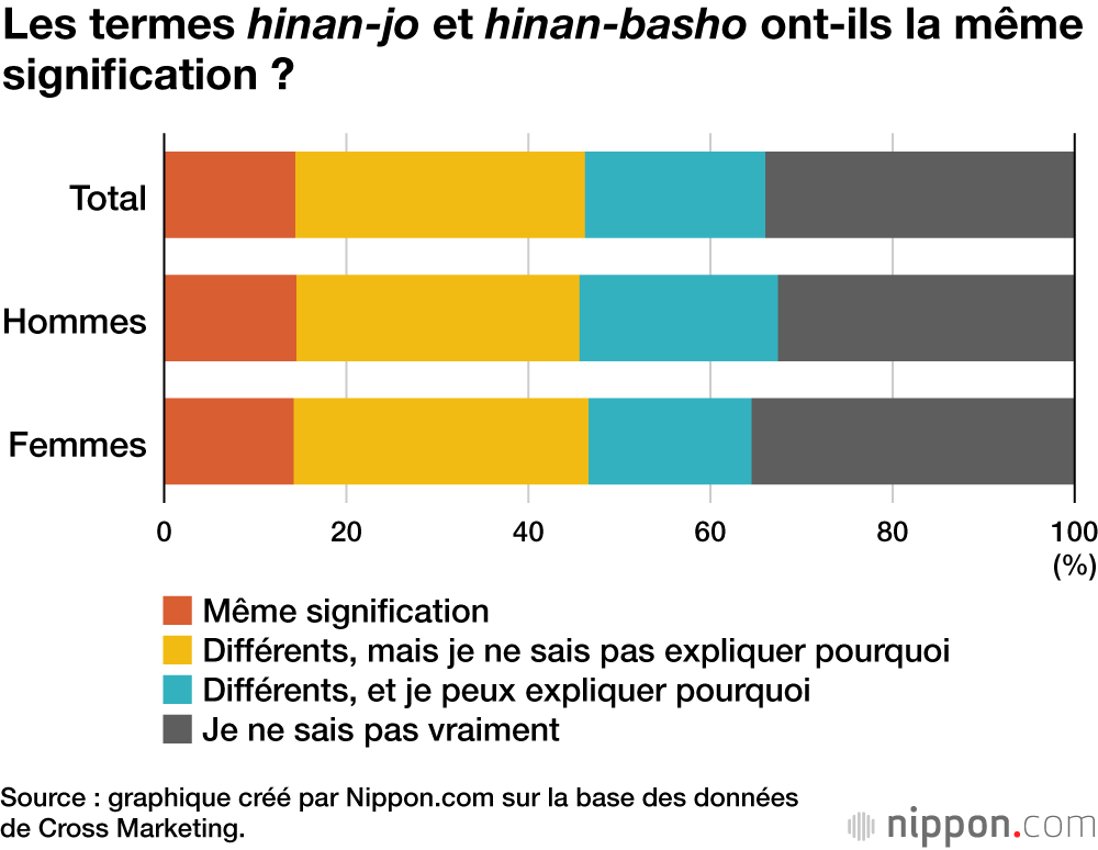 À la question « Quelle est la différence entre hinan-jo et hinan-basho ? », 34 % des sondés répondent « Je ne sais pas vraiment », 31,8 % indiquent savoir qu’il existe une différence, sans pouvoir l’expliquer et 14,4 % répondent qu’il s’agit de « la même chose ». Seuls 19,8 % disent « comprendre la différence et pouvoir l’expliquer ».