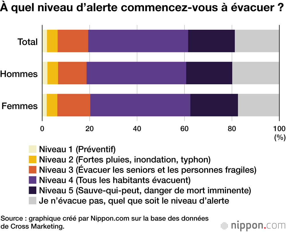 À la question de savoir à quel niveau d’alerte ils évacueraient, 42,1 % des sondés indiquent le niveau 4, quand l’ordre d’évacuer concerne tous les habitants de la zone. Mais 18,7 % des personnes interrogées disent « ne pas évacuer, quel que soit le niveau d’alerte » expliquant que « {leur} maison est plus sûre » ou qu’« il n’y a pas assez d’intimité dans les centres d’évacuation ».