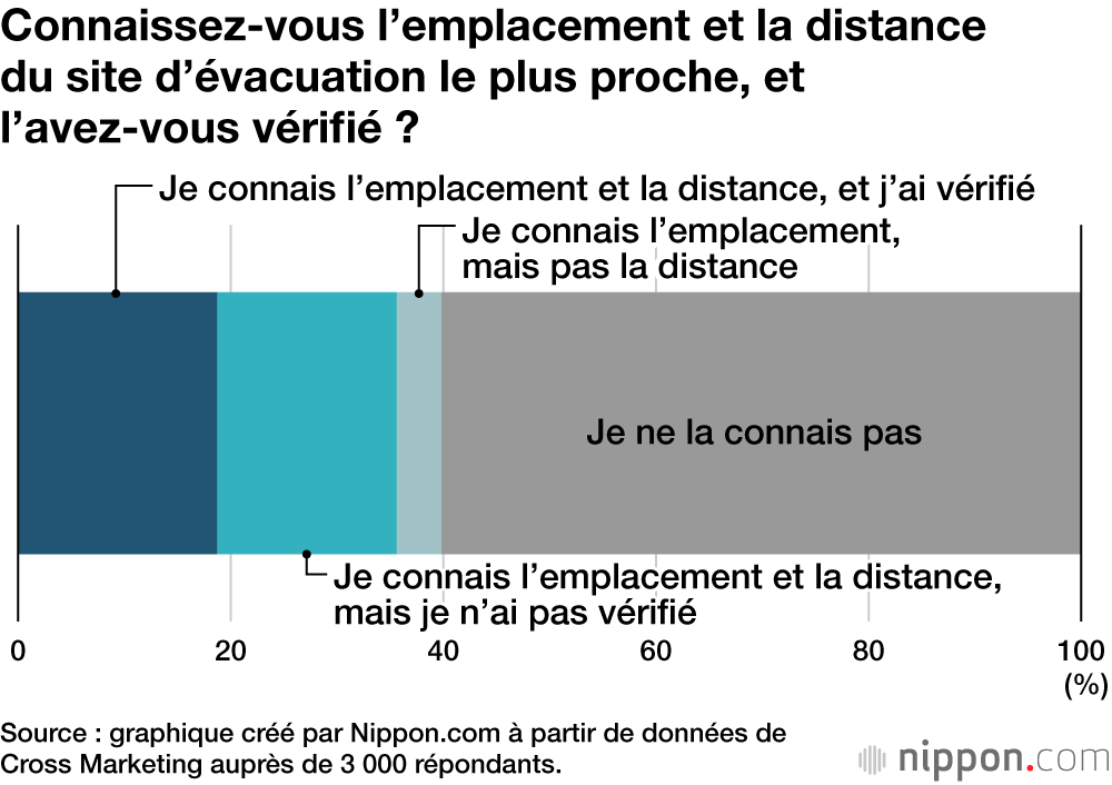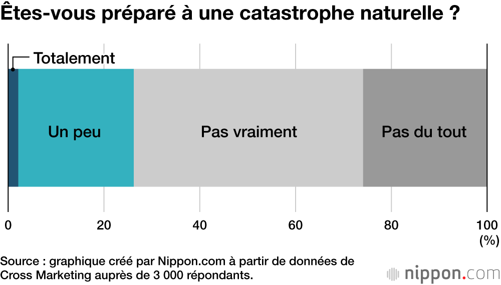 Dans une enquête menée au Japon, seulement environ un quart des répondants ont indiqué être « totalement » ou « plutôt » préparés à une catastrophe. Plus de 30 % des personnes âgées de la vingtaine à la quarantaine ont affirmé n’avoir pris aucune mesure de préparation.