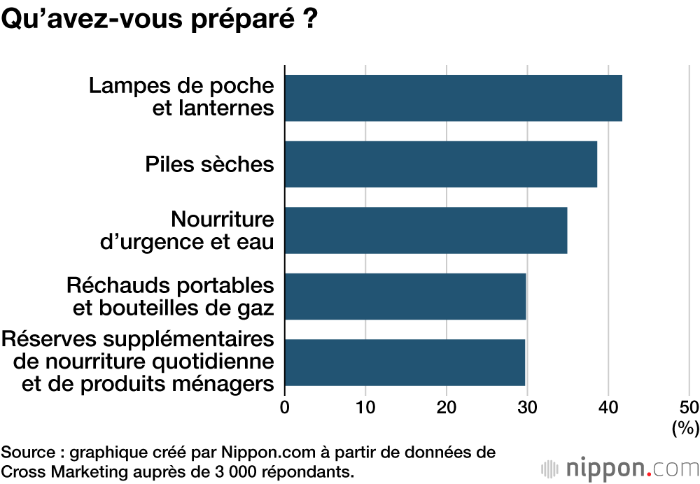 Les réponses multiples étaient possibles dans cette enquête, et à 41,7 %, ce que chaque sondé avait le plus souvent préparé était « un dispositif d’éclairage, comme des lampes de poche ou des lanternes ». Suivaient 38,6 % de personnes ayant prévu des « piles sèches », et environ un tiers disposant de « nourriture d’urgence, denrées non périssables et eau ». Les « toilettes portables utilisables sans eau » représentaient 20,1 % (soit une hausse de 5,4 points par rapport à l’enquête de l’année précédente).