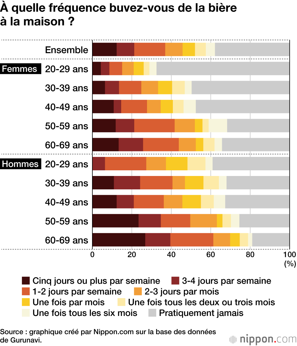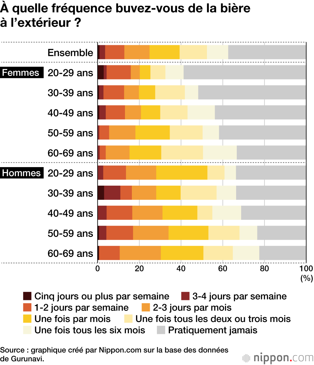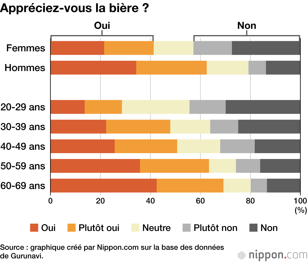 Un sondage sur la bière mené par le site d’informations sur les restaurants Gurunavi auprès de 1 300 personnes âgées de 20 à 69 ans a montré que 52,1 % d’entre elles ont déclaré « aimer » ou « plutôt aimer » cet alcool.