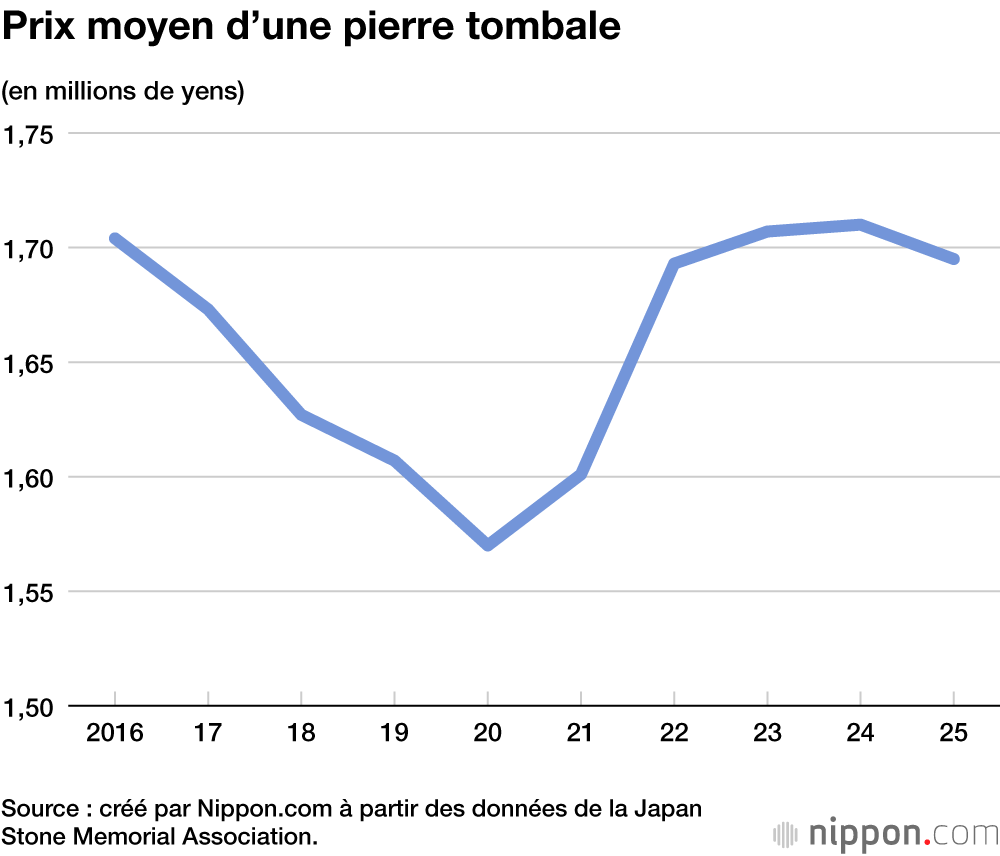 Selon l’enquête, le prix d’achat le plus fréquent pour une pierre tombale (hors coût de la concession) se situe entre 1,5 et 2 millions de yens (8 500 et 11 000 euros), une fourchette citée par 20,3 % des répondants. Viennent ensuite les prix compris entre 2 et 3 millions de yens (18,7 %). Le prix d’achat moyen d’une pierre tombale s’établit à 1 695 000 yens, soit 15 000 yens de moins que l’année précédente. Sur les quatre dernières années, la moyenne est restée stable, autour de 1,7 million de yens.