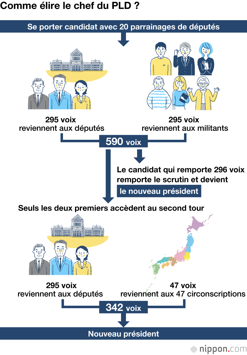 Vu que le PLD gouverne au sein d’une coalition, le vainqueur de cette élection a de fortes chances de devenir Premier ministre, mais cette nomination ne lui garantira pas une accession au pouvoir. En effet, en ce moment le PLD et son soutien, le Kômeitô, ne détiennent la majorité des sièges dans aucune des deux chambres. Or c’est là que se jouera l’élection du prochain Premier ministre japonais.