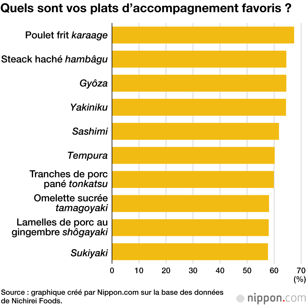 Un sondage réalisé en ligne en août 2025 a proposé à 14 000 personnes de donner leur(s) accompagnement(s) préféré(s) dans une liste de 30 mets. Le poulet frit karaage est arrivé en tête (67,4 %) pour la cinquième année consécutive, suivi par le steak haché, les raviolis chinois (gyôza) et les lamelles de viande grillée (yakiniku), tous avec un pourcentage d’environ 64 %.
