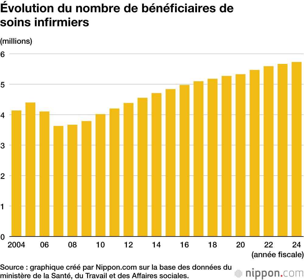 Les chiffres du ministère de la Santé, du Travail et des Affaires sociales pour l’année fiscale 2024 (avril 2024 - mars 2025) montrent que le coût des dépenses de soins infirmiers pour les bénéficiaires inscrits au Japon, prestations d’assurance et dépenses personnelles comprises, a augmenté de 403,2 milliards de yens (2,27 milliards d’euros) par rapport à l’exercice précédent, atteignant 11 600 milliards de yens (65 milliards d’euros). Les dépenses de soins préventifs pour des pathologies moins graves ont quant à elles augmenté de 20,9 milliards de yens pour atteindre 320,2 milliards de yens, portant le total des dépenses à 11 900 milliards de yens. Il s’agit d’une hausse de 424,2 milliards de yens par rapport à l’exercice 2023.