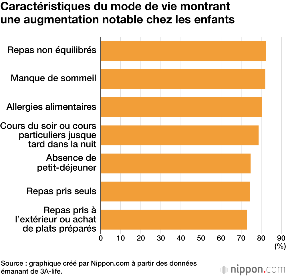 L’enquête s’est tout d’abord intéressée à l’évolution du style de vie des enfants ces dernières années. Plus de 80 % des sondés ont cité une augmentation des repas peu équilibrés, un manque de sommeil et des allergies alimentaires. L’étude pointe également une qualité de vie médiocre ; certains enfants ont des rythmes de vie plus difficiles et plus stressants que les adultes en raison des cours du soir ou encore de cours particuliers qui se poursuivent jusque tard dans la nuit. Ils sont par ailleurs nombreux à ne pas prendre de petit-déjeuner et à ne pas manger de repas faits maison.