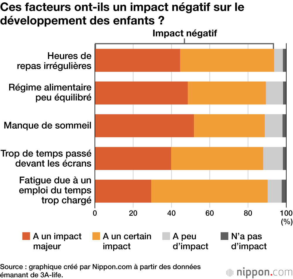 90 % des médecins interrogés ont cité une hygiène de vie dangereuse pour la santé des enfants. Selon eux, des heures de repas irrégulières, un régime alimentaire peu équilibré et un manque de sommeil ont un impact négatif sur leur développement.