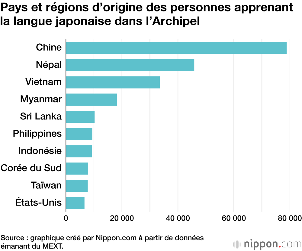 S’agissant des pays et régions d’origine des apprenants, 85 % viennent du continent asiatique. Les Chinois sont les plus nombreux, avec 78 821 personnes, suivie du Népal, du Vietnam, du Myanmar et du Sri Lanka.