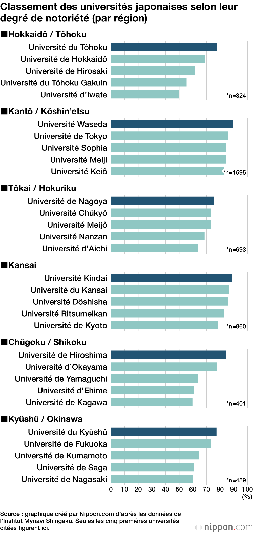 Ailleurs dans le pays, les universités nationales se sont distinguées comme les établissements ayant la notoriété la plus grande, avec l’Université du Tôhoku en tête dans la région de Hokkaidô (nord) et du Tôhoku (nord-est), l’Université de Nagoya en tête dans la région du Chûgoku (sud-ouest de l’île principale du Japon) et Shikoku (île du sud-ouest), et l’Université du Kyûshû en tête dans la région de Kyûshû (île du sud-ouest) et Okinawa (sud). Cela contraste avec la région du Kantô-Kôshinetsu, où les universités privées occupent les premières places.