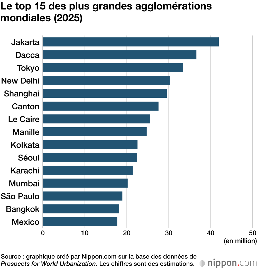 En 2005, Tokyo occupait la 1ere place mondiale avec 31,4 millions d’habitants. Les projections à l’horizon 2050 indiquent toutefois un recul de sa population à 30,7 millions, ce qui la ferait descendre à la 7e place du classement.