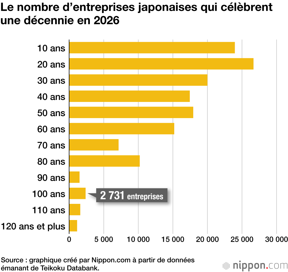 Selon des données collectées par l’institu de recherche Teikoku Databank, pas moins de 2 731 entreprises japonaises ont soufflé leur centième bougie en 2026 et 17 939 ont fêté leurs 50 ans d’activité. Par ailleurs, 145 159 entreprises fêtent une nouvelle décennie.