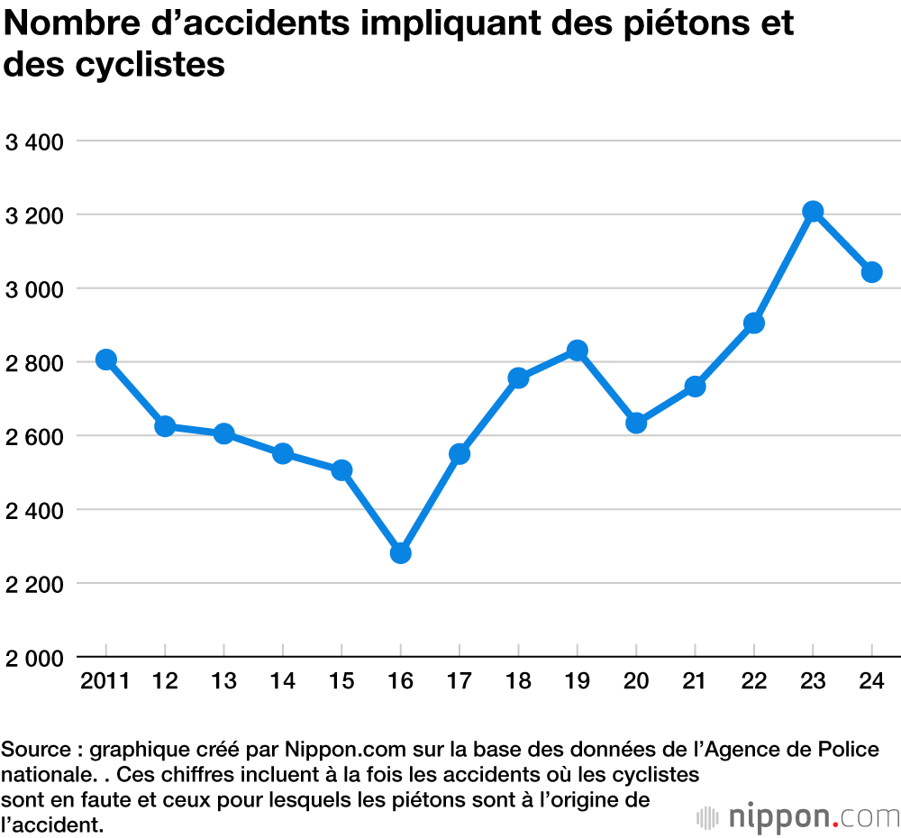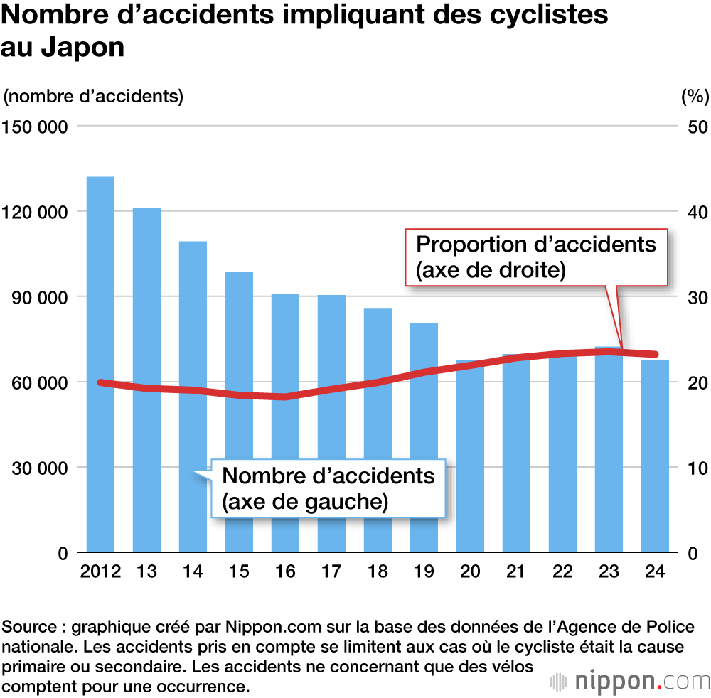 Le nombre d’accidents de la circulation impliquant des cyclistes ayant causé la mort ou des blessures a tendanciellement augmenté entre 2021 et 2023. Plus de 70 000 cas étaient recensés en 2023. Mais alors que le nombre total d’accidents de la route diminue d’année en année, celui impliquant des cyclistes est plutôt en augmentation. En 2024, il y en a eu 23,2 % de plus qu’en 2023 et dans 75 % de ces accidents, c’est le cycliste qui était en faute.