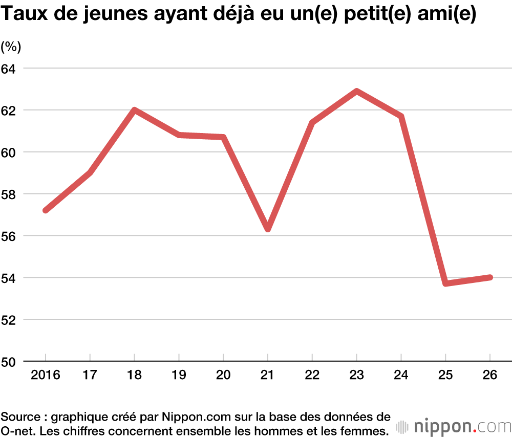 Interrogés sur leurs expériences passées, 54,8 % des jeunes hommes et 53,0 % des jeunes femmes ont indiqué avoir déjà eu un(e) petit(e) ami(e), soit 54,0 % au total. Par ailleurs, 34,3 % des répondants ont déclaré être actuellement en couple avec une personne du sexe opposé, en hausse de 6,5 points de pourcentage par rapport à l’année précédente, avec une progression observée aussi bien chez les hommes (36,9 %) que chez les femmes (30,8 %).