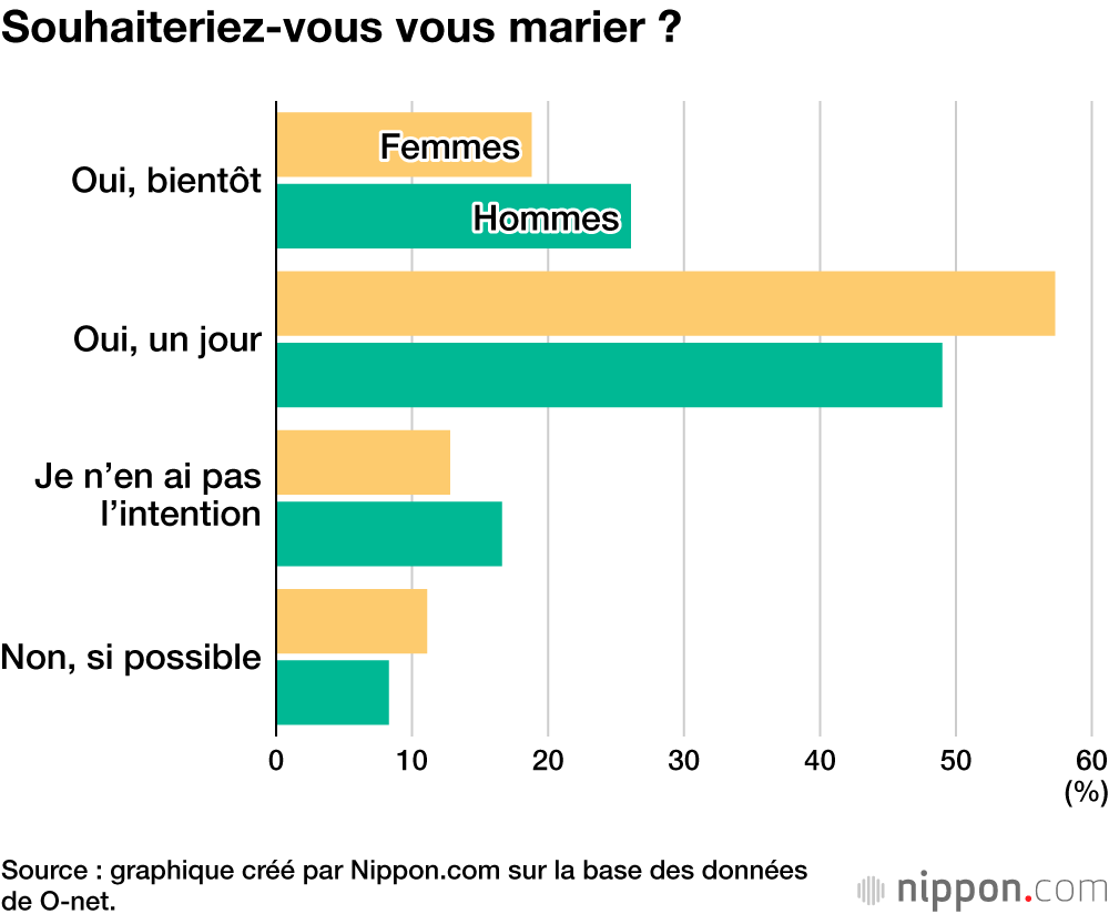 Dans l’ensemble, 75,6 % des personnes interrogées ont indiqué « souhaiter se marier bientôt » ou « souhaiter se marier un jour », un niveau en hausse par rapport à l’année précédente, qui avait enregistré le résultat le plus bas jamais observé pour cette enquête. En revanche, environ 10 % des jeunes, hommes comme femmes, ont exprimé une opinion négative du mariage.