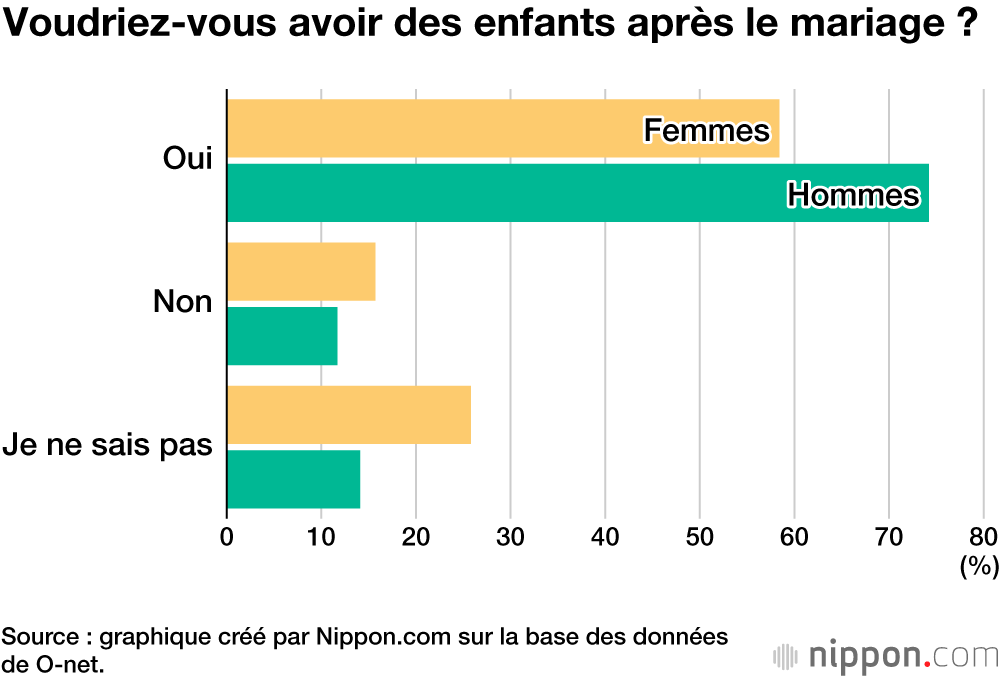 Parmi les répondants souhaitant se marier à court ou à long terme, 67,7 % ont déclaré vouloir avoir des enfants après le mariage, un niveau record sur les dix dernières années. Dans le détail, cette proportion atteint 74,2 % chez les jeunes hommes et 58,4 % chez les jeunes femmes.