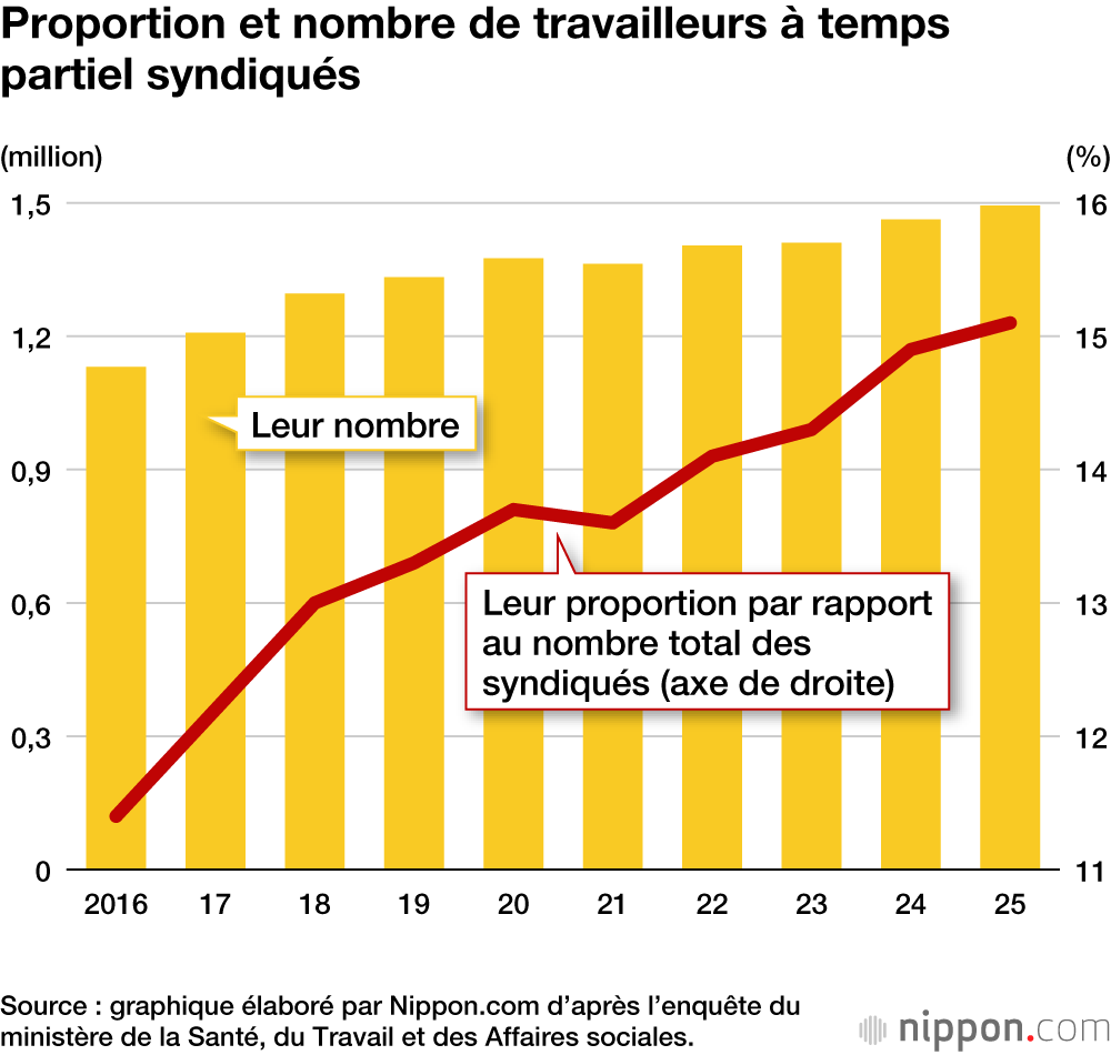 Le nombre de syndiqués travaillant à temps partiel a atteint un nouveau record de 1 491 000, avec 31 000 personnes de plus qu’en 2024 (+ 2,1 %). Leur part dans le total des effectifs syndicaux est de 15,3 % (+ 0,2 point). Mais le taux de syndicalisation des travailleurs à temps partiel reste pratiquement inchangé (8,8 % de l’ensemble). Le Japon compte par ailleurs 22 244 syndicats, soit 268 de moins qu’en 2024.
