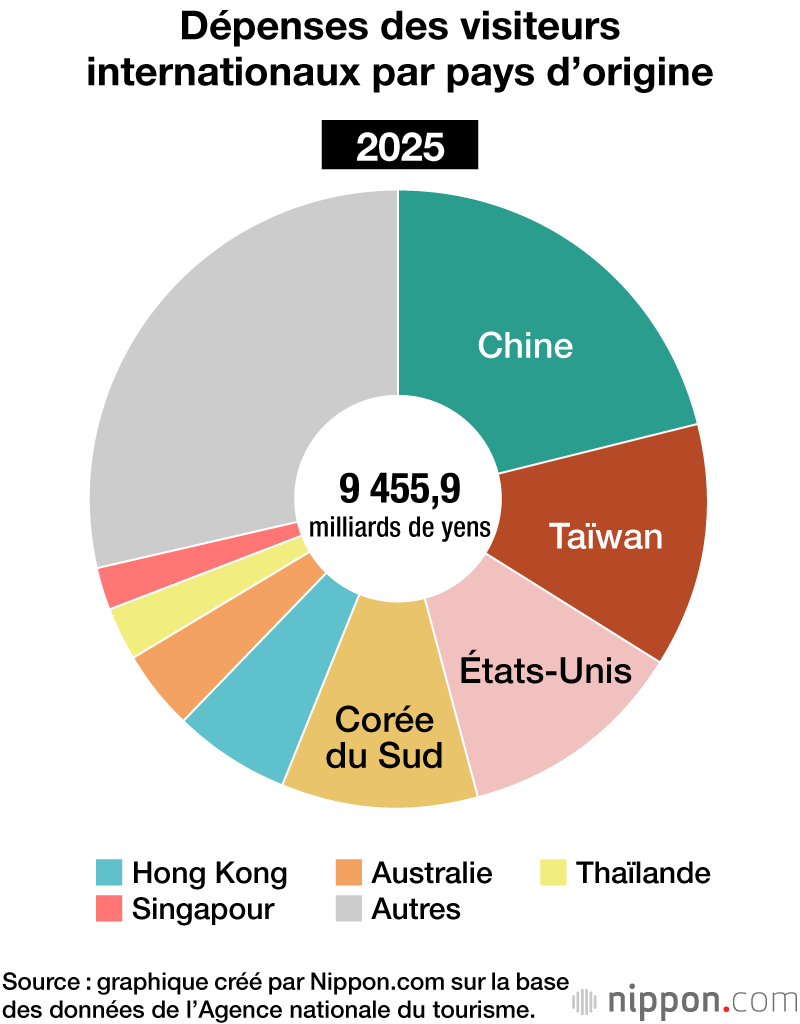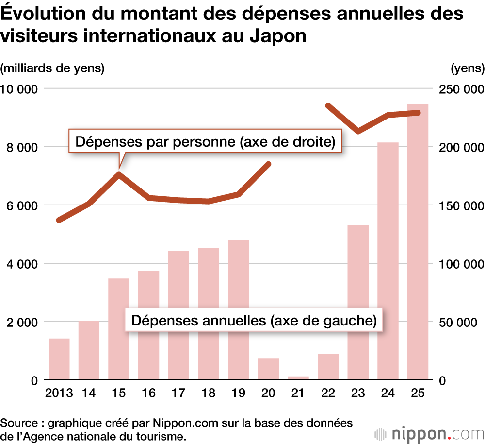 Les chiffres préliminaires publiés par l’Agence du tourisme du Japon montrent que les dépenses annuelles des visiteurs internationaux en 2025 ont atteint un record de 9 455,9 milliards de yens (51,6 milliards d’euros), soit une hausse de 16,4 %.