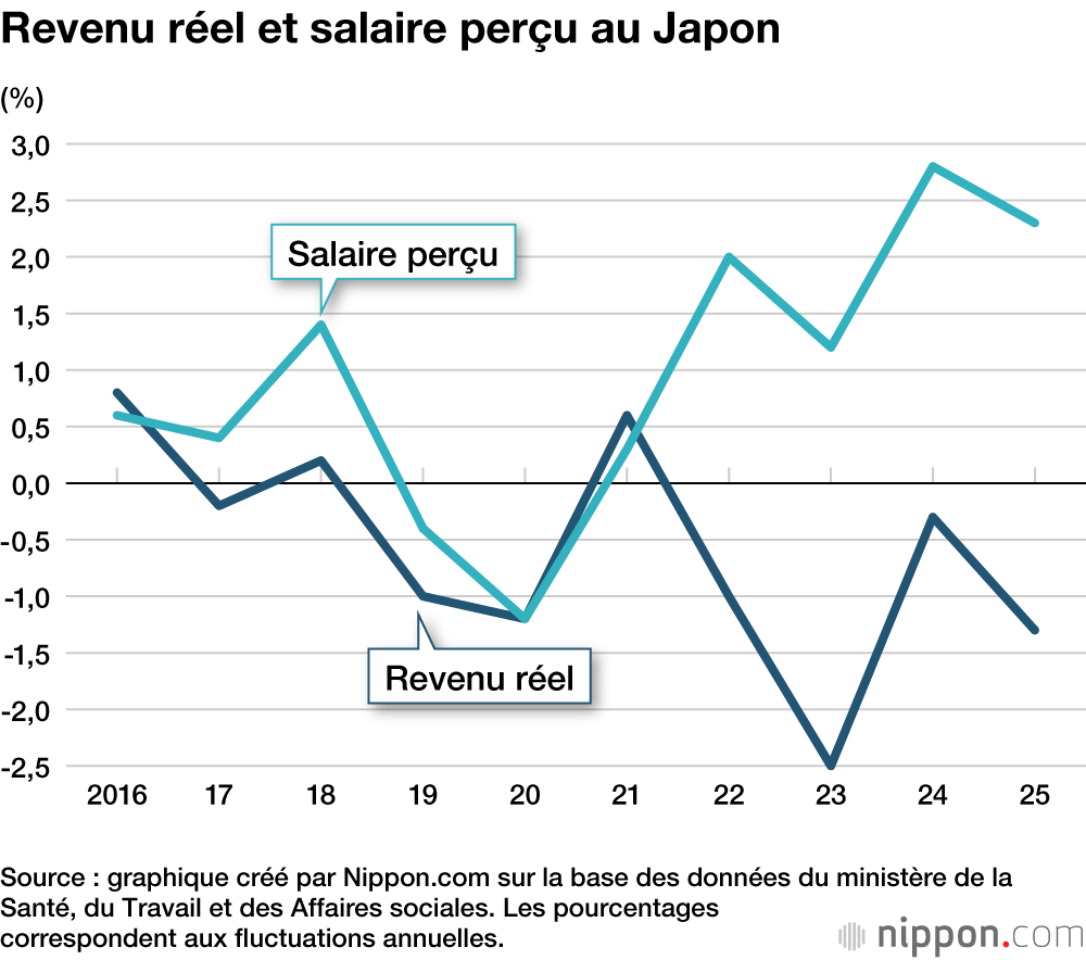 Selon les chiffres du ministère de la Santé, du Travail et des Affaires sociales, en 2025 le revenu réel (corrigé de l’inflation) a baissé de 1,3 % par rapport à 2024. Avec 355 919 yens mensuels en moyenne (environ 1 950 euros), le salaire de base a certes augmenté de 2,3 %, mais cette hausse est neutralisée par l’augmentation des prix à la consommation de 3,7 %. Pour chaque tranche mensuelle, le revenu réel est en baisse tendancielle par rapport à 2024, il ne parvient pas à rattraper l’inflation.