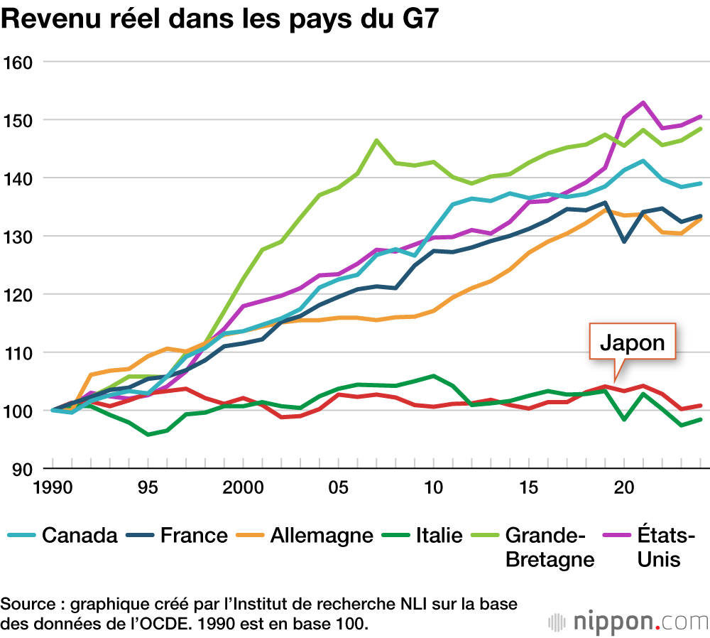 La stagnation prolongée du revenu réel au Japon saute aux yeux, même à l’échelle internationale. Le Japon et l’Italie sont les seuls pays du G7 à n’avoir pratiquement pas vu leur revenu réel évoluer depuis 1990. Le contraste est grand avec les États-Unis, où le revenu réel est aujourd’hui environ 1,5 fois plus important qu’en 1990.