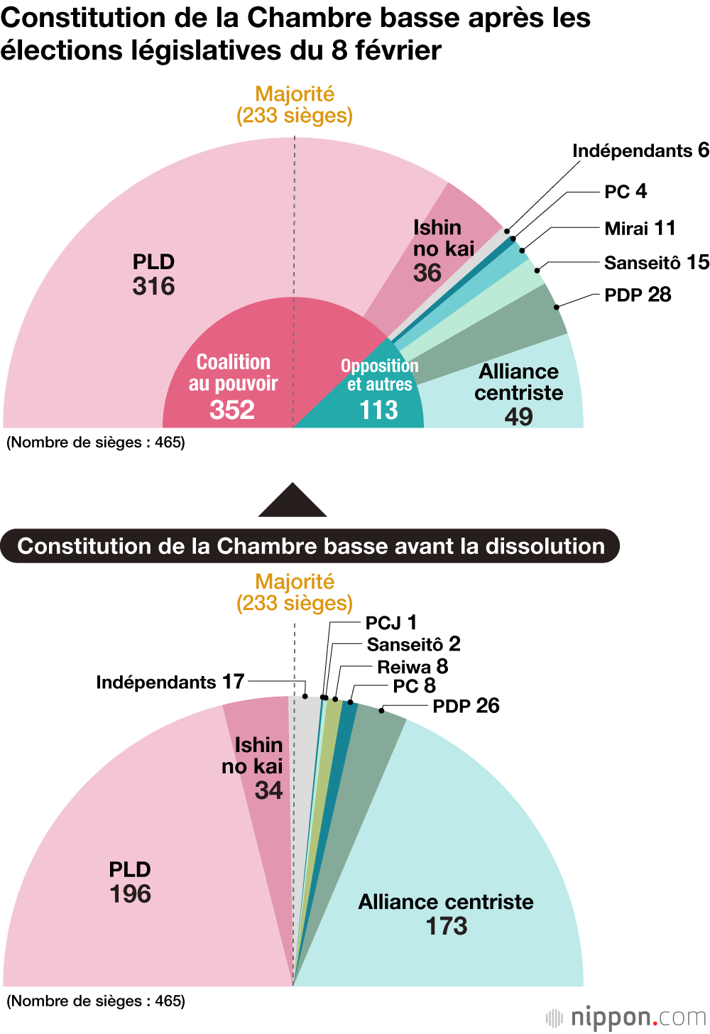 Les élections à la Chambre des représentants, la chambre basse du Parlement japonais, qui se sont tenues le dimanche 8 février se sont achevées le lendemain à l’aube avec l’attribution de tous les sièges. Le Parti libéral-démocrate (PLD) a remporté une victoire historique en obtenant à lui seul 316 députés, dont un candidat supplémentaire soutenu, soit plus des deux tiers du total de la chambre. Avec les 36 sièges du Nippon Ishin no kai (Parti de l’innovation du Japon), le bloc au pouvoir atteint un total de 352 sièges, obtenant ainsi une écrasante majorité.