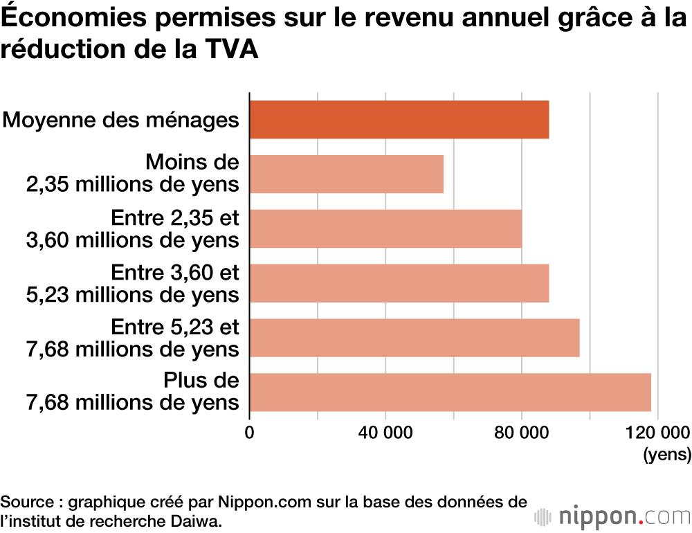 Selon l’Institut de recherche Daiwa, la suppression permettrait aux ménages d’économiser en moyenne 88 000 yens par an (480 euros). Si l’on ventile ces chiffres par niveau de revenu, on constate que les ménages à revenus élevés, qui ont tendance à consommer davantage, profiteraient davantage de la mesure, et ceux appartenant à la tranche de revenu la plus élevée (20 %) seraient deux fois plus bénéficiaires que la tranche des foyers aux revenus les plus bas (20 %). L’institut conclut qu’au final « d’importantes ressources fiscales seraient mobilisées au profit de ménages qui ont le moins besoin d’aides pour maintenir leur niveau de vie ».