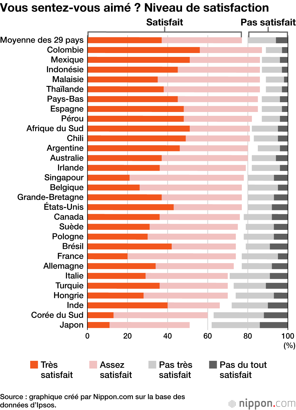 « Vous sentez-vous aimé ? » À cette question, le Japon arrive en dernière position : seuls 51 % des répondants déclarent être « très satisfaits » ou « assez satisfaits » à cet égard. Ce taux est nettement inférieur à la moyenne des 29 pays, qui s’établit à 77 %.