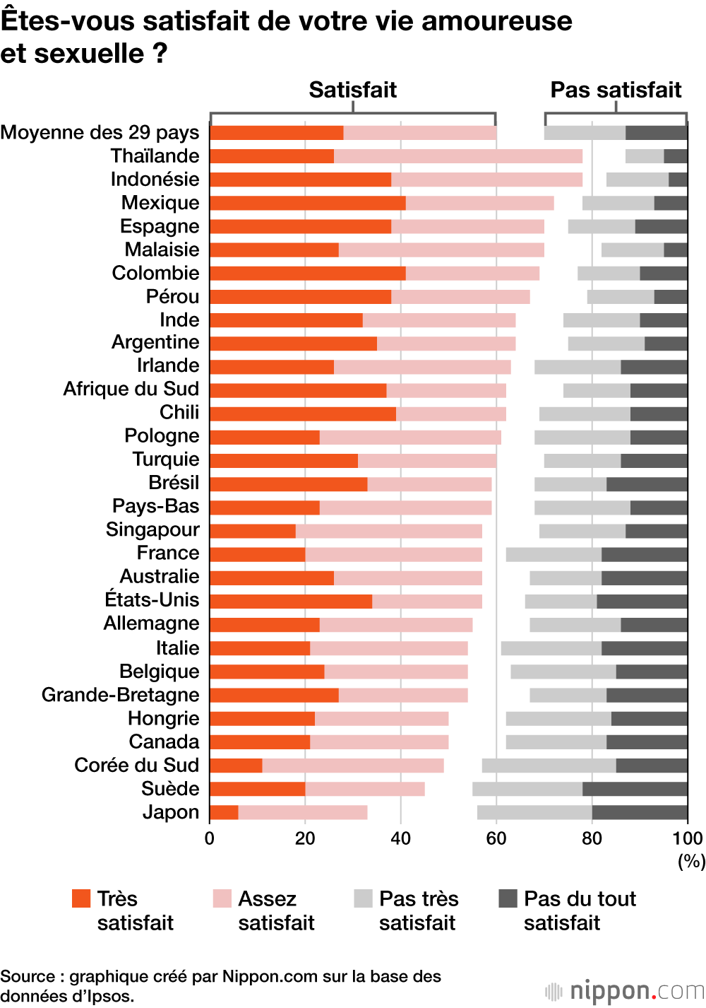 En effet, 33 % des personnes interrogées se déclarent « très satisfaites » ou « plutôt satisfaites » de leur vie amoureuse ou sexuelle, soit une baisse de 6 points par rapport à l’enquête précédente. Ce niveau représente seulement un peu plus de la moitié de la moyenne mondiale, qui s’établit à 60 %. En outre, un maigre pourcentage de 6 % des Japonais se disent « très satisfaits », le Japon étant le seul pays où cette proportion est inférieure à 10 %.