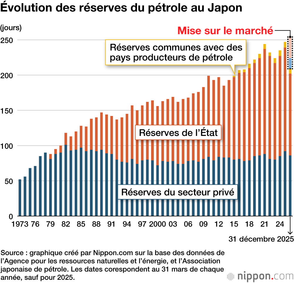 Au 31 décembre 2025, les réserves publiques japonaises représentaient l’équivalent de 146 jours de consommation, tandis que les réserves du secteur privé correspondaient à 101 jours et les réserves communes avec des pays producteurs à 7 jours. Au total, ces stocks représentaient 254 jours de consommation, soit environ 470 millions de barils.
