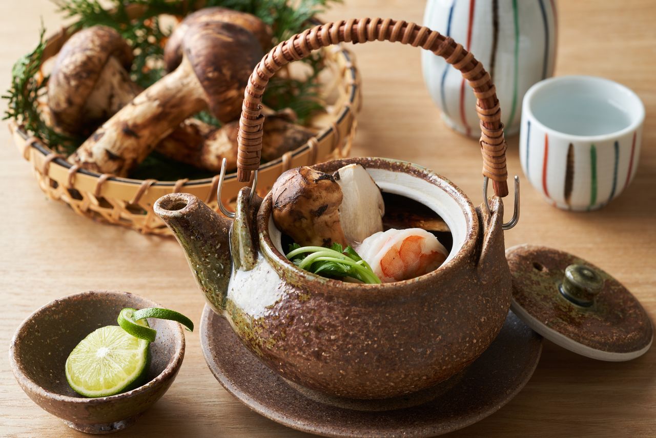Un élégant dobin-mushi, composé de champignons matsutake, de crevettes, de noix de gingko cuits à la vapeur dans un bouillon, le tout relevé d’un zeste d’agrume sudachi parfumé.