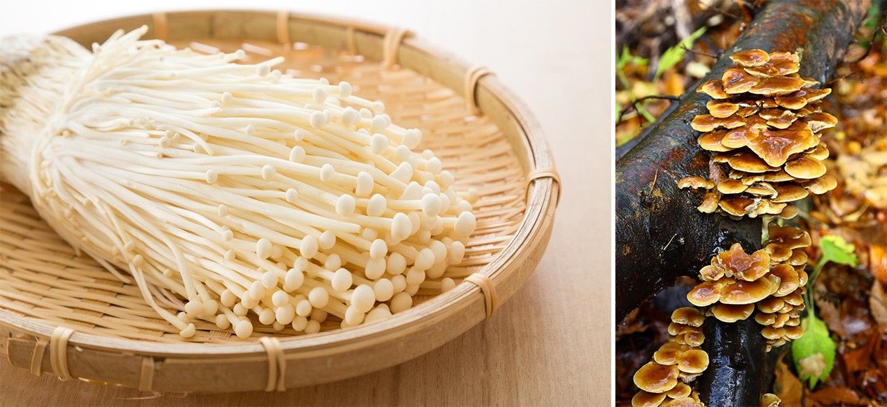 Autrefois, un grand nombre de variétés de champignons n’étaient disponibles qu’en automne et leur récolte se faisait à la main. Selon des archives, il y a environ 300 ans, les agriculteurs japonais ont commencé à cultiver le shiitake. Ils utilisaient pour ce faire de petites bûches qu’ils perforaient pour y cultiver des spores de champignons. Cette méthode s’est améliorée au fil des siècles, et elle est encore utilisée aujourd’hui. Le développement des chambres de culture, où des éléments tels que la température sont minutieusement régulées, et l’utilisation de sciure de bois riche en nutriments spécifiques, permettent maintenant aux consommateurs de se régaler de champignons bon marché et fraîchement cueillis quand ils le veulent, à tout moment de l’année. Il existe une vingtaine de variétés commercialisées dans les supermarchés ou dans des boutiques. Parmi les plus courantes, le nameko, l’enokitake et le shimeji.