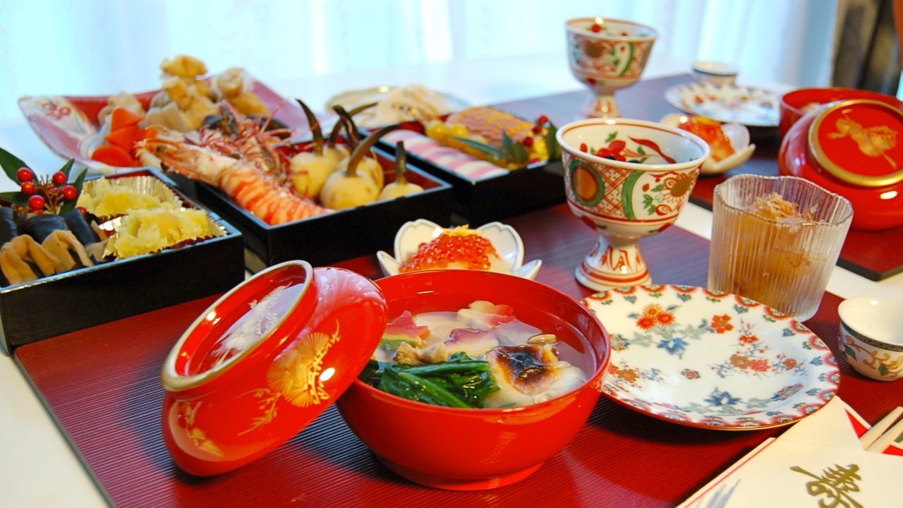 De nombreux aliments issus de la terre et de la mer sont cuisinés pour l’occasion. Souvent porteurs de bon augure, ils permettent de préparer des mets colorés et très bien équilibrés d’un point de vue nutritionnel. Ils sont également conçus pour pouvoir être mangés les jours suivants, car dans la tradition cela permettait aux femmes, habituellement occupées par les tâches ménagères pendant toute l’année, de faire une pause au Nouvel An.