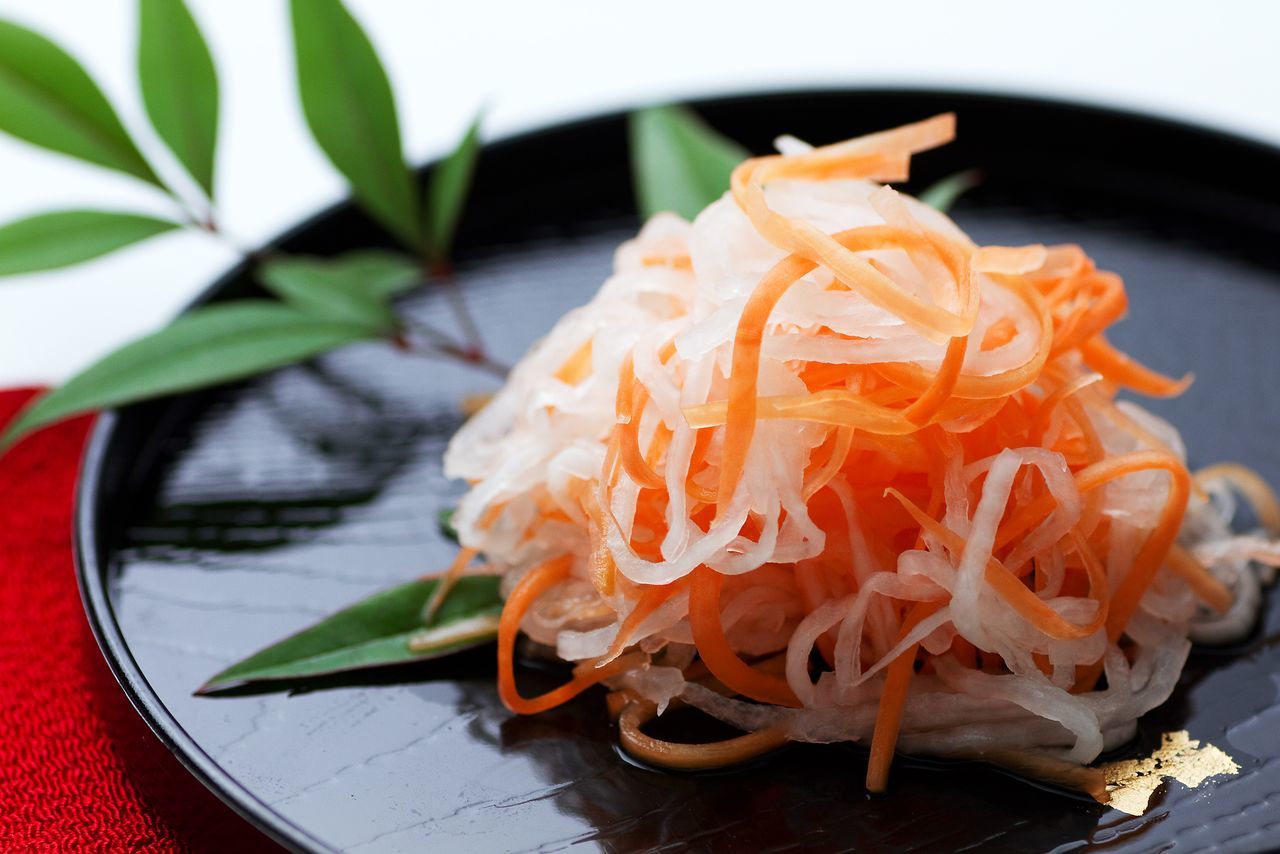 Le rouge est la couleur de la célébration et le blanc de tout ce qui est sacré. Le namasu est fait de carottes râpées et de radis blanc daikon assaisonnés avec une sauce aigre-douce. Le daikon est riche en vitamine C et en diastase, qui aide à digérer l’amidon. Excellente source de bêta-carotène, la carotte est un remède efficace contre la fatigue et précurseur de la vitamine A.