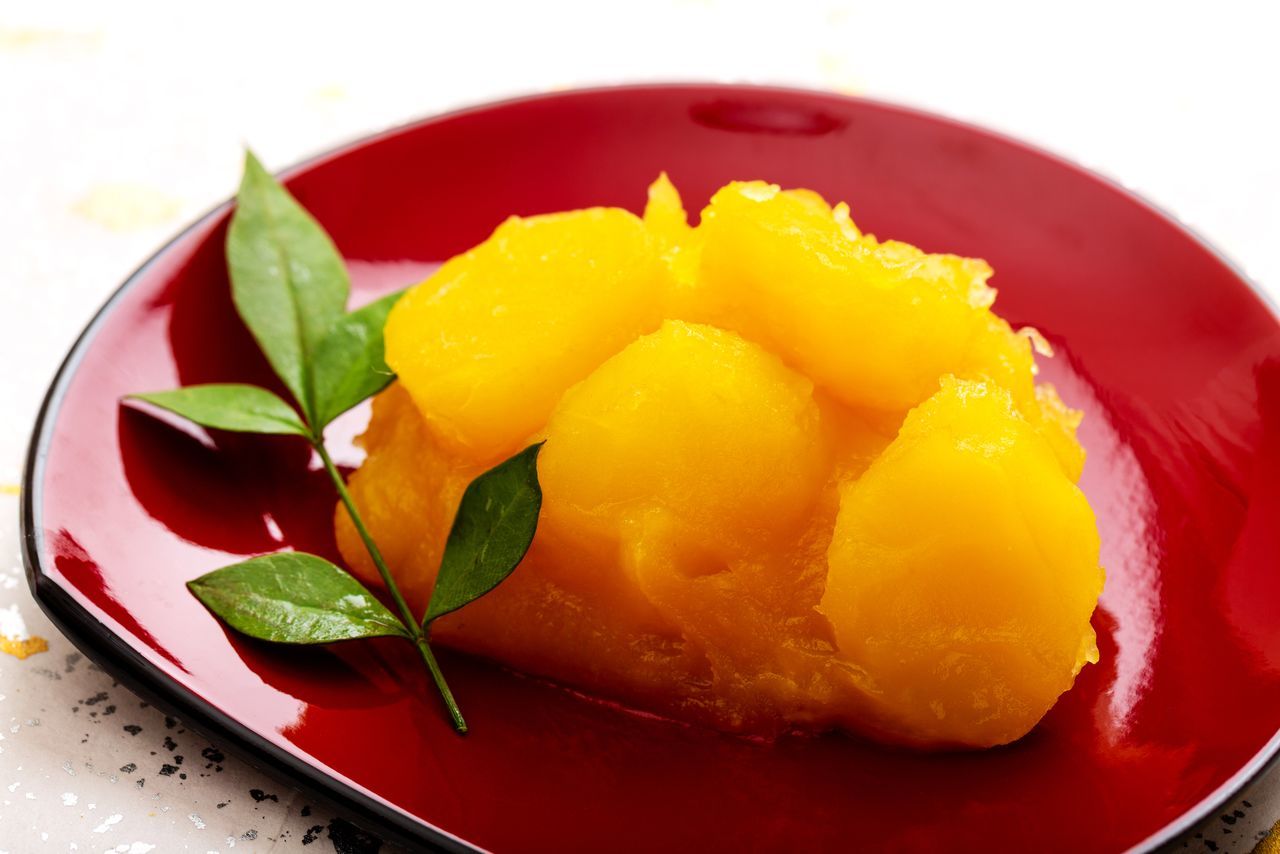 Le kuri kinton est fait de châtaignes confites servies avec une pâte de patate douce. La couleur dorée de ce mets symbolise le vœu de réussite financière pour les entreprises, commerces et toute la famille.
