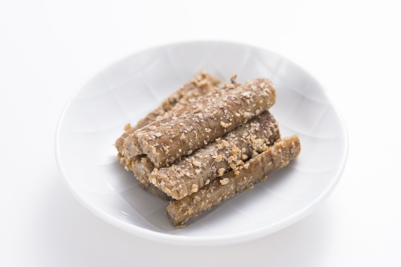 Après avoir tapé le gobô (racine de bardane) avec un pilon pour briser les fibres, les racines sont cuisinées avec du vinaigre sanbaizu et du sésame. Comme la bardane pousse en profondeur dans le sol, elle apporte la prospérité pour toute la famille. Riche en fibres, elle permet de réguler la flore intestinale et le taux de cholestérol.