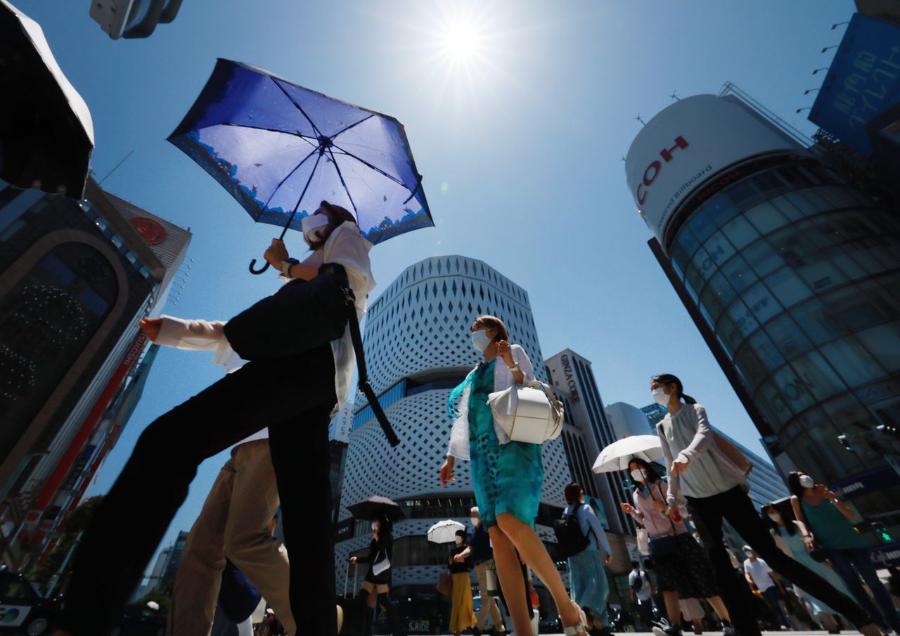 Piétons marchant avec des ombrelles sous un fort soleil. (Jiji Press)