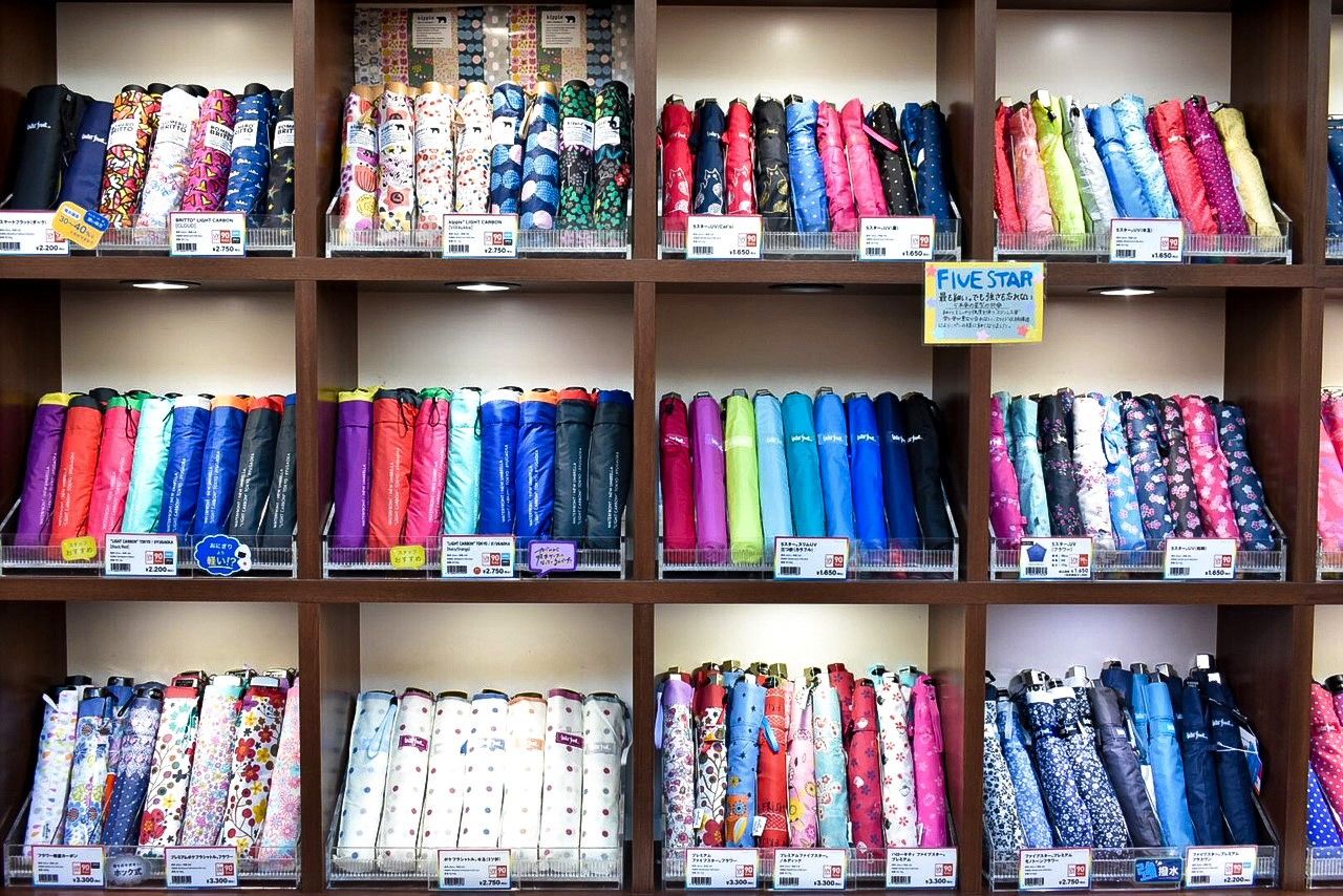 Après la saison des pluies qui se termine en juillet commence l’été, avec un très fort ensoleillement. Les ombrelles sont alors de sortie et prennent la place des parapluies. Depuis quelques années, les modèles hybrides, qui servent aussi bien de parapluie que d’ombrelle, avec un design neutre, ni masculin, ni féminin, ni jeune ni senior, ont gagné en popularité.