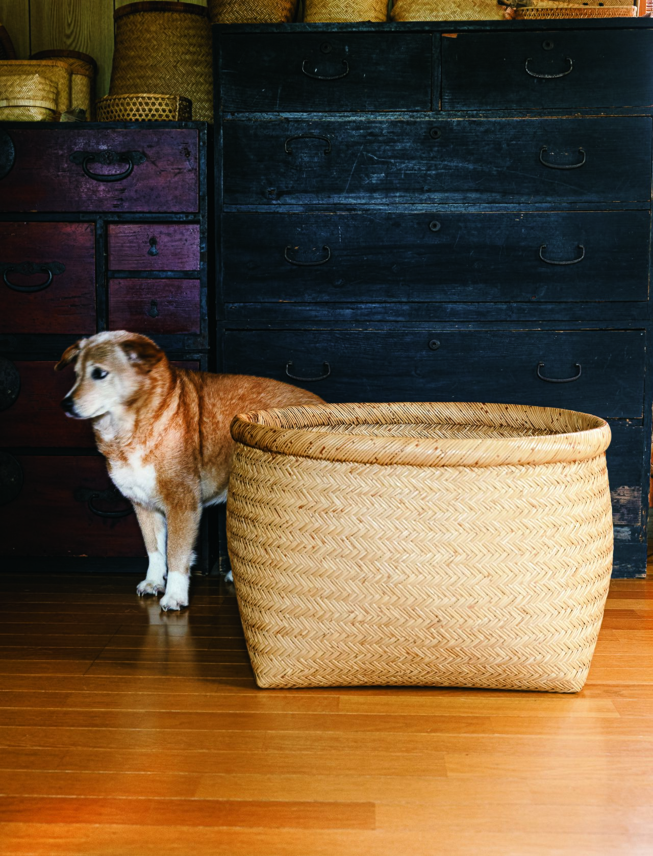 Chako, la chienne de Shibata, avec le panier oboke, la dernière œuvre de sa mère, Emiko. (© Arimoto Yayoi)