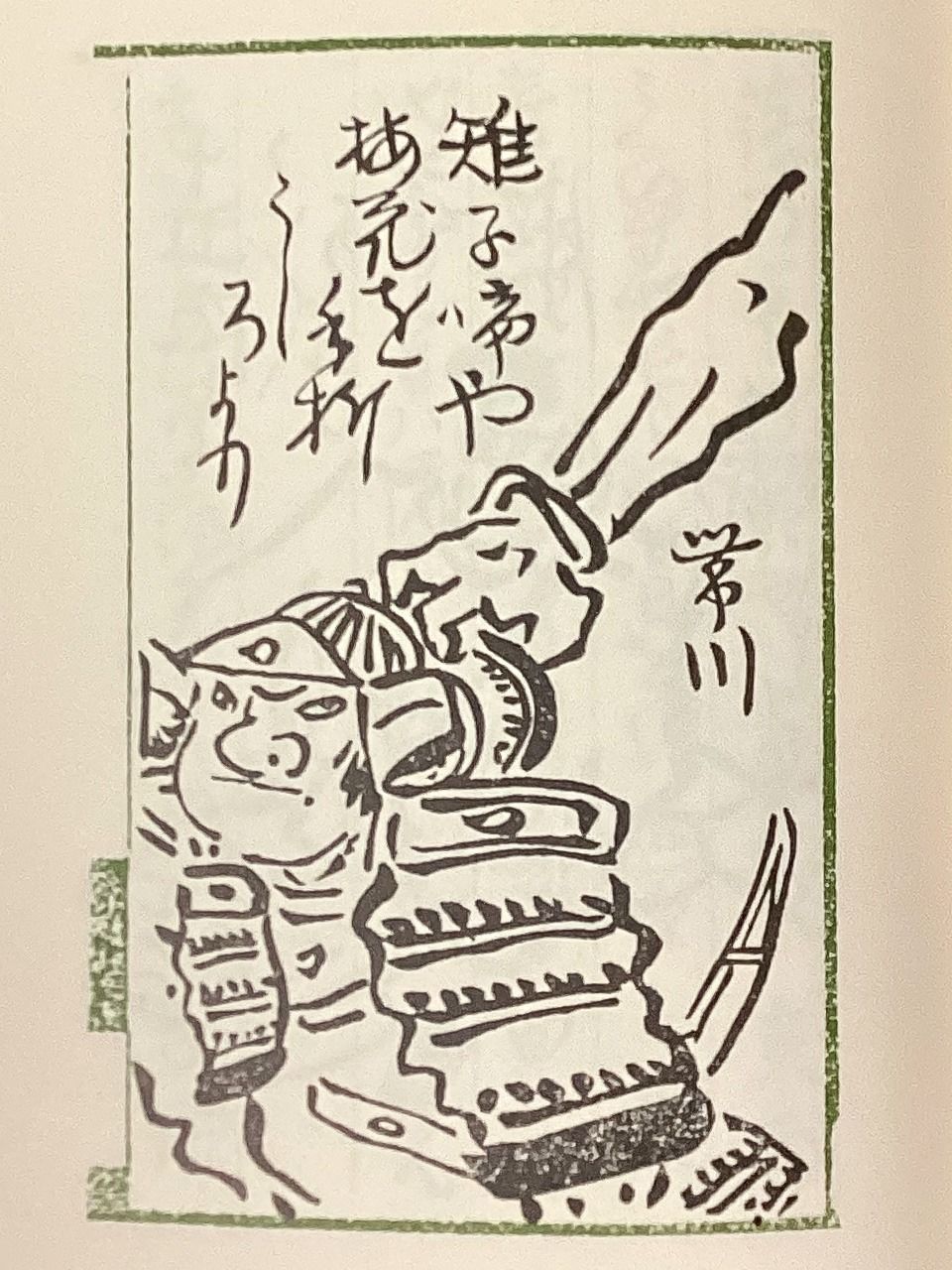Mais en contrepoint du poème que son disciple Taisen a composé lors d’une promenade au début du printemps, Buson dessine une scène tirée de la célèbre pièce de nô intitulée « Rashômon ». Watanabe no Tsuna est attaqué par derrière près de la porte Rashômon à Kyoto, on voit le bras d’un démon (oni) s’emparer du casque du guerrier. À première vue, on pourrait croire que le dessin n’a aucun lien avec le poème, mais le thème de l’attaque surprise est bien là. Buson s’est amusé à tisser les références et a joué le jeu du clin d’œil littéraire.