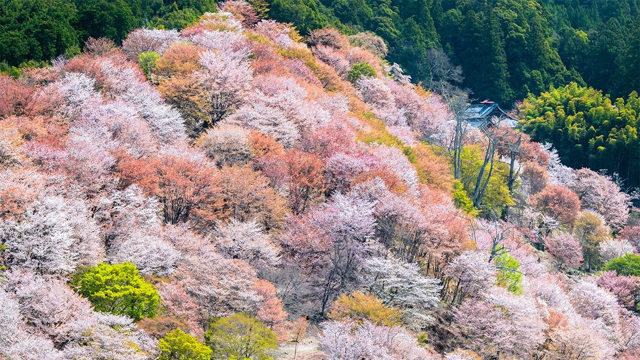 Le mont Yoshino (dans l’actuelle préfecture de Nara) est de longue date célèbre pour ses cerisiers en fleur. Quand le grand Matsuo Bashô s’est rendu sur place, il a fait référence au haïku de Teishitsu dans son journal de voyage intitulé « Le Carnet de la hotte » (Oi no kobumi). À Yoshino-yama, les yama-zakura sont des cerisiers sauvages qui fleurissent plus tôt que les célèbres somei-yoshino. Et comme les petites fleurs blanches éclosent en même temps que les jeunes pousses du feuillage rouge, l’admirable spectacle de la floraison est unique en son genre.