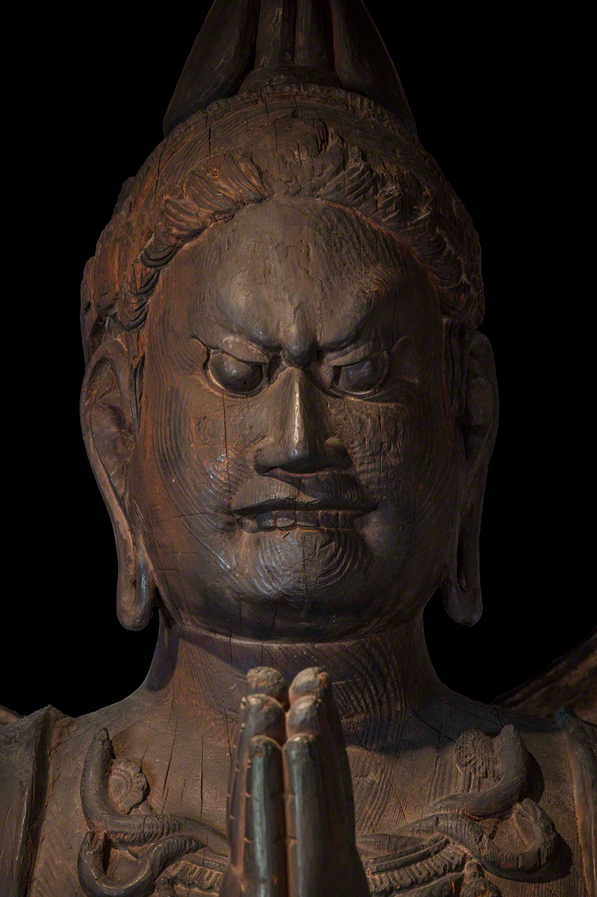 Par ailleurs, Kannon est le bodhisattva symbolisant la compassion, on le représente souvent avec un visage doux et féminin. Seul le Kannon à tête de cheval a cet air courroucé qui le rapproche des Myô-ô utilisant leur force surhumaine pour vaincre le mal. C’est pourquoi la statue a également pu être appelée « Myô-ô à tête de cheval » ou « Myô-ô de la grande force ». La figure hausse les sourcils, découvre ses dents, se mord la lèvre inférieure et arbore un regard menaçant, on dirait qu’elle va pousser un cri de guerre. Ces traits font donc plutôt penser à un Kannon à tête de cheval. Nous tenons peut-être là une forme primitive de Batô Kannon, sculptée avant que le canon de la statuaire n’ait été stabilisé.