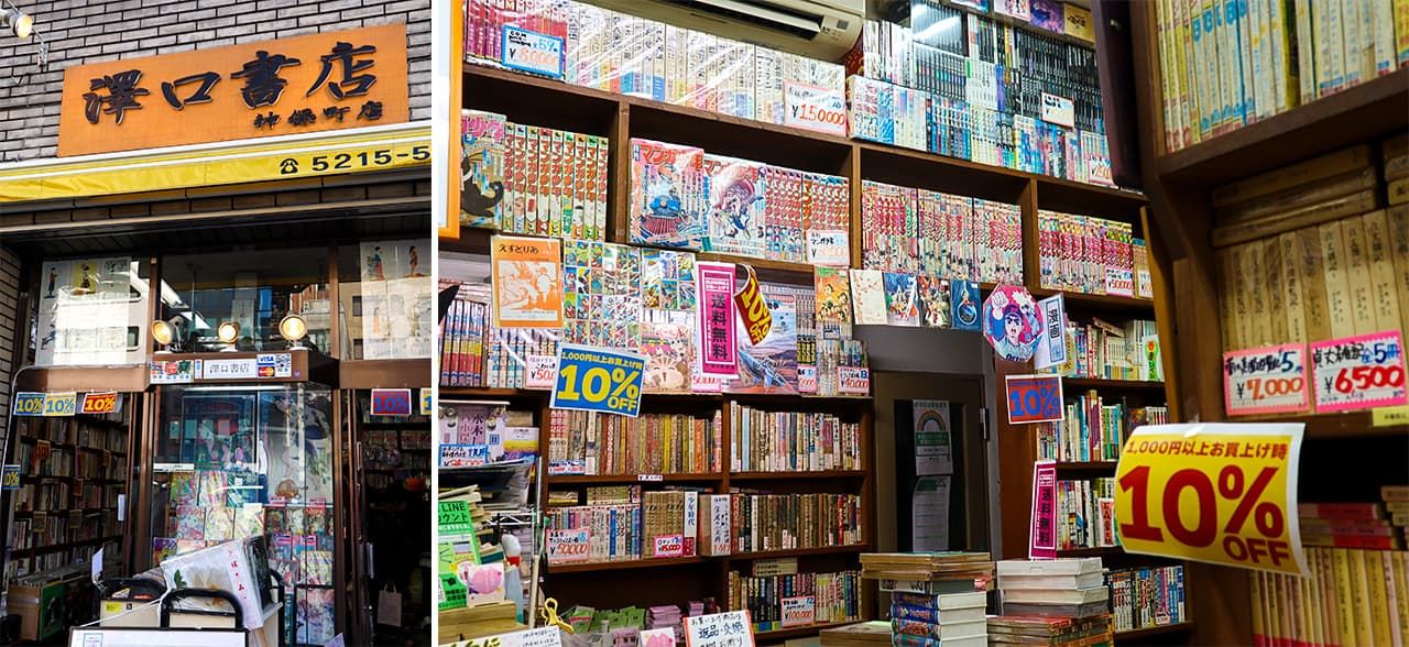 Sawaguchi Shoten possède trois points de vente dans le quartier et chacun a son identité propre. L’enseigne Jinbôchô est spécialisée dans les mangas ; après le décès de Toriyama Akira en mars 2024, une exposition hommage a été organisée dans la librairie, on pouvait y découvrir une série complète de Dragon Ball et des volumes de Shônen Jump avec Dr Slump en couverture. Les rayons du petit magasin débordent de mangas épuisés.