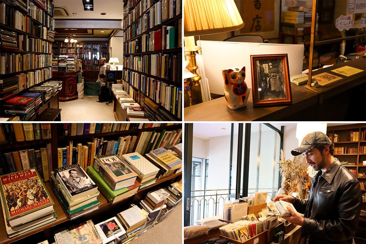 Fondé en 1902, Kitazawa Shoten, se trouve au premier étage du Kitazawa Building. On se croirait dans un magnifique cabinet de travail, le bouquiniste propose plus de 10 000 livres sur les arts libéraux ainsi qu’une très belle sélection sur la littérature britannique et américaine. Les clients flânent dans les rayons et prennent plaisir à dévorer les livres des yeux. C’est là que nous rencontrons Maximiliano Lara (en photo en bas à droite), un jeune Chilien venant de Melbourne. C’est son deuxième voyage au Japon, mais c’est la première fois qu’il se rend à Jinbôchô. Apparemment à la recherche du souvenir parfait, il examine les ex-libris, regarde les cartes anciennes et s’attarde sur les cartes postales.
