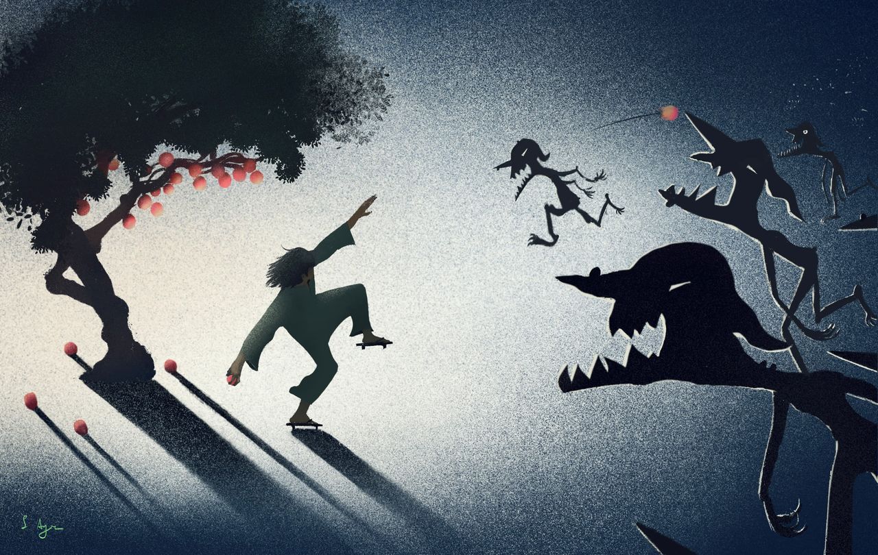 Les deux premiers s’exécutent et règnent selon le souhait de leur père. Susanoo, cependant, ne cesse de se lamenter jusqu’à ce qu’il devienne adulte, arborant une longue barbe. Ses complaintes assèchent les arbres sur les collines et tarissent les rivières et les océans. Pis encore, elles attirent les divinités maléfiques qui se mettent à bourdonner autour de lui telle une nuée de mouches en plein été, provoquant cataclysme après cataclysme.