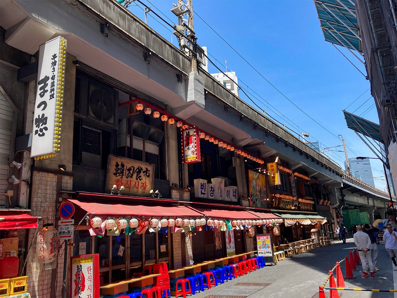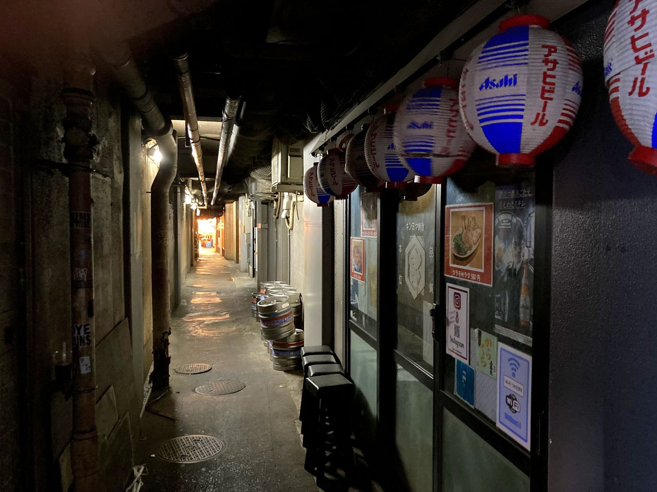 L’intérieur du quartier (situé du côté ouest des voies) offre un contraste total. À peine sorti de la gare, on se retrouve dans un dédale de ruelles étroites regorgeant de bars, restaurants, karaokés et établissements dédiés aux plaisirs plus sulfureux. De jour, la zone reste relativement calme, mais dès la nuit tombée, elle s’anime au rythme des salarymen et des salarywomen en quête de réconfort, de nourriture et de divertissement. Le quartier a certes changé depuis l’époque où les commerces se réduisaient à quelques tôles ondulées et où les clients s’asseyaient sur des caisses de bière ou des tabourets rouillés, mais l’ambiance demeure bruyante (et un brin rugueuse).