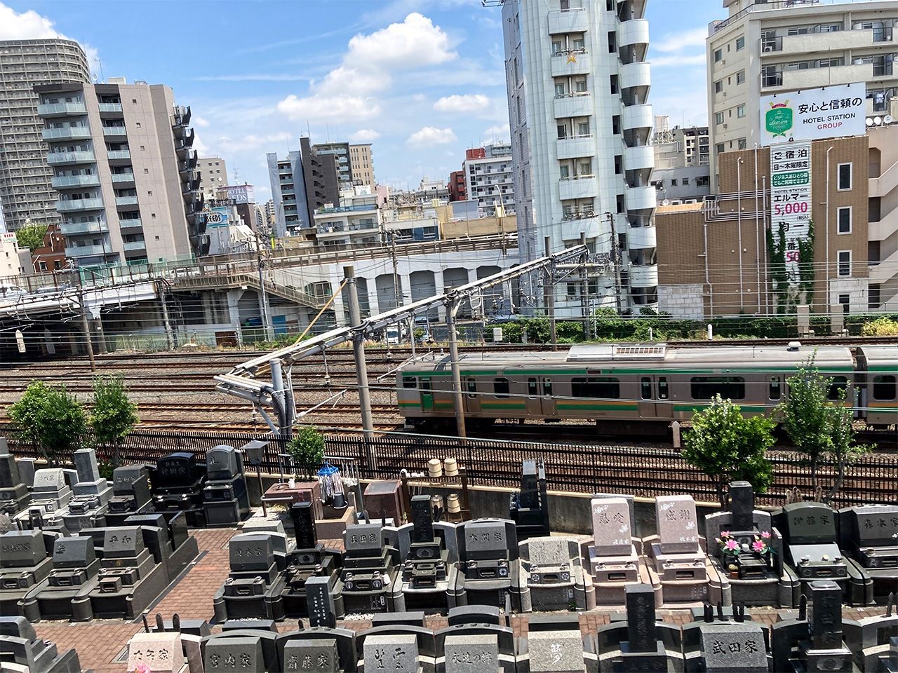 De l’autre côté de la gare, presque personne n’habite : l’endroit est entièrement occupé par le vaste cimetière du Kan’ei-ji. C’est ce qui explique pourquoi Uguisudani est la deuxième gare la moins fréquentée de la Yamanote, derrière la Takanawa Gateway (environ 23 000 passagers selon une étude JR East de 2023).