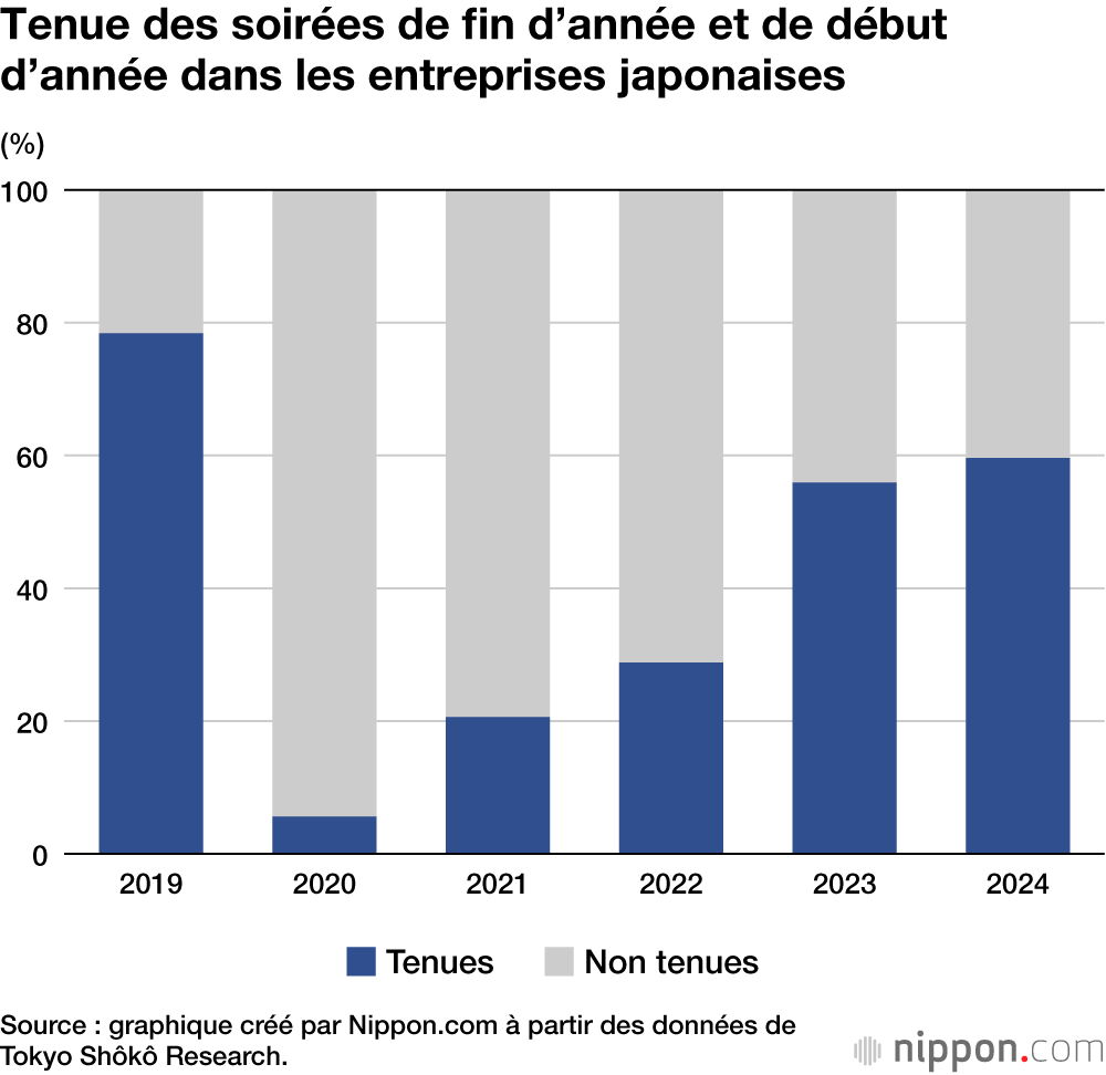 Mais cette culture d’entreprise évolue à toute vitesse. D’après une enquête réalisée en 2024 par Tokyo Shôkô Research, seules 59,6 % des entreprises ont organisé des soirées de fin ou de début d’année, soit près de 20 points de moins qu’en 2019 (avant la pandémie de coronavirus). Entre la baisse d’intérêt des salariés et les protestations de plus en plus ouvertes contre ces pratiques, ces rendez-vous festifs n’ont pas retrouvé leur popularité d’antan, malgré la levée des restrictions sanitaires.
