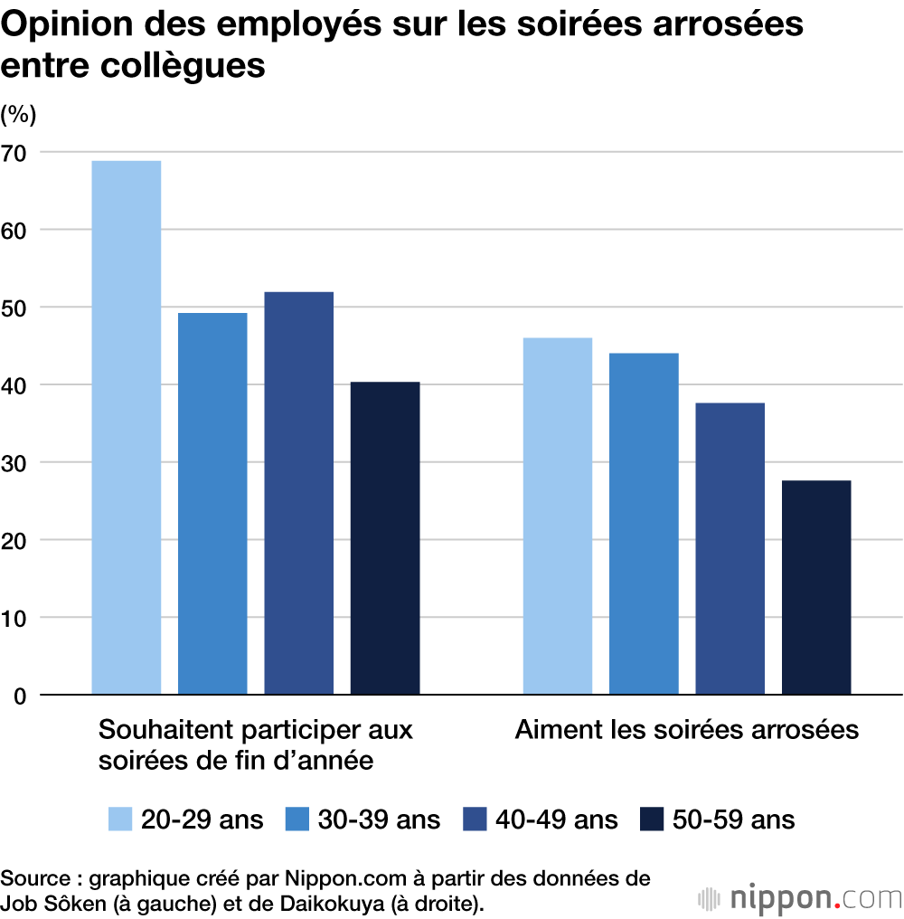 Mais les idées reçues sont parfois trompeuses. Une enquête menée en 2024 par Job Sôken révèle que ce sont en réalité les salariés les plus âgés qui se montrent les plus réticents à l’égard des nomikai. Parmi les employés dans la vingtaine, 68,8 % se disent favorables à l’idée de participer à une fête de fin d’année, contre 51,9 % chez les quadragénaires et 40,3 % chez les quinquagénaires. Une autre étude, réalisée en 2023 par Daikokuya livre des résultats similaires : 46 % des personnes dans la vingtaine et 44 % des trentenaires déclarent apprécier les soirées alcoolisées entre collègues, contre 37,6 % des quadragénaires et seulement 27,6 % des quinquagénaires.
