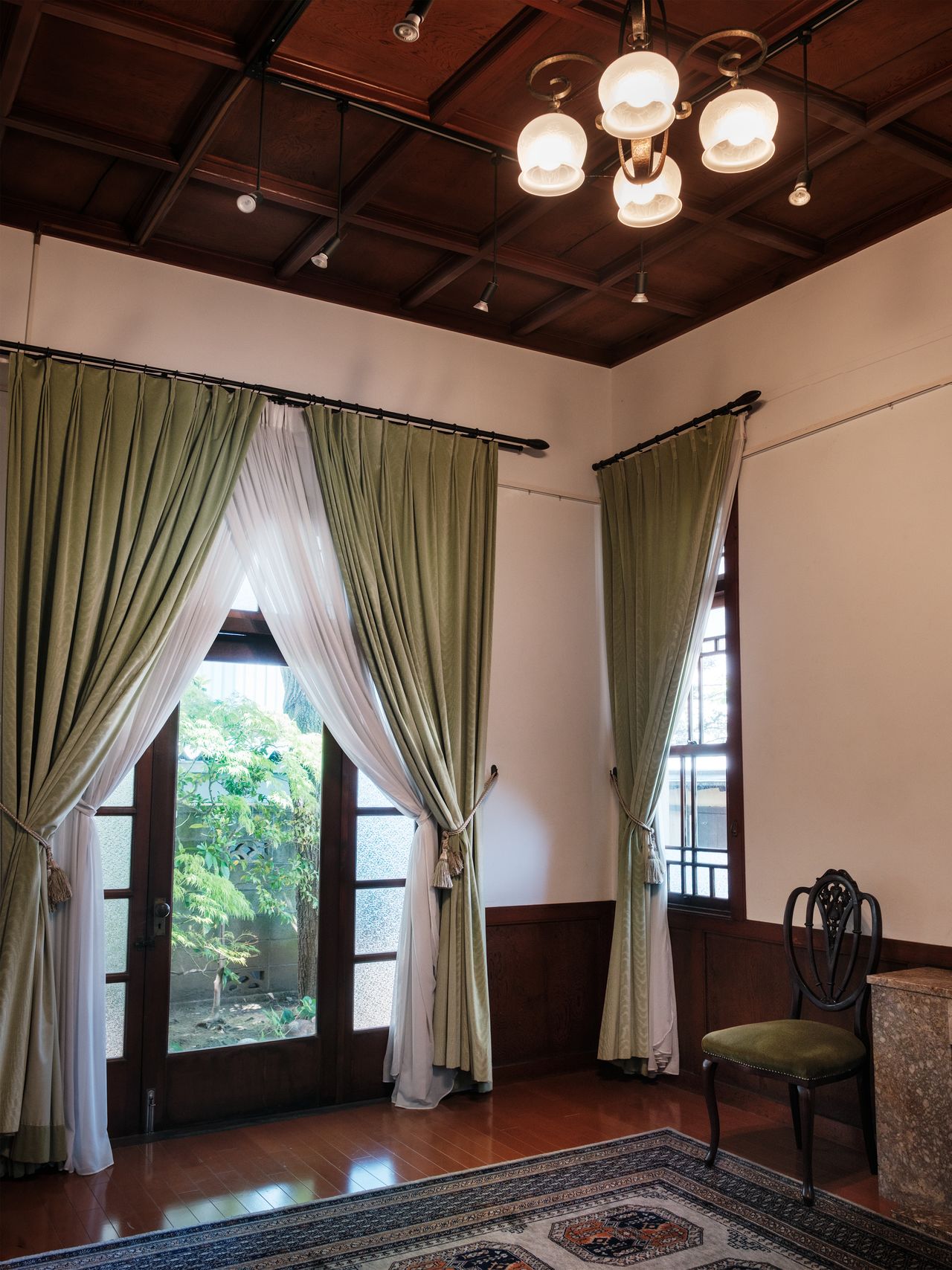 Au nord-ouest de la maison se trouve une pièce de style occidental, autrefois utilisée pour recevoir les clients de l’entreprise de l’ancien propriétaire. Elle sert aujourd’hui de salle d’attente lorsque les places du café sont toutes occupées. Ses portes et fenêtres d’époque, ainsi que le lustre suspendu à un splendide plafond à caissons en bois massif, créent une atmosphère empreinte de nostalgie.