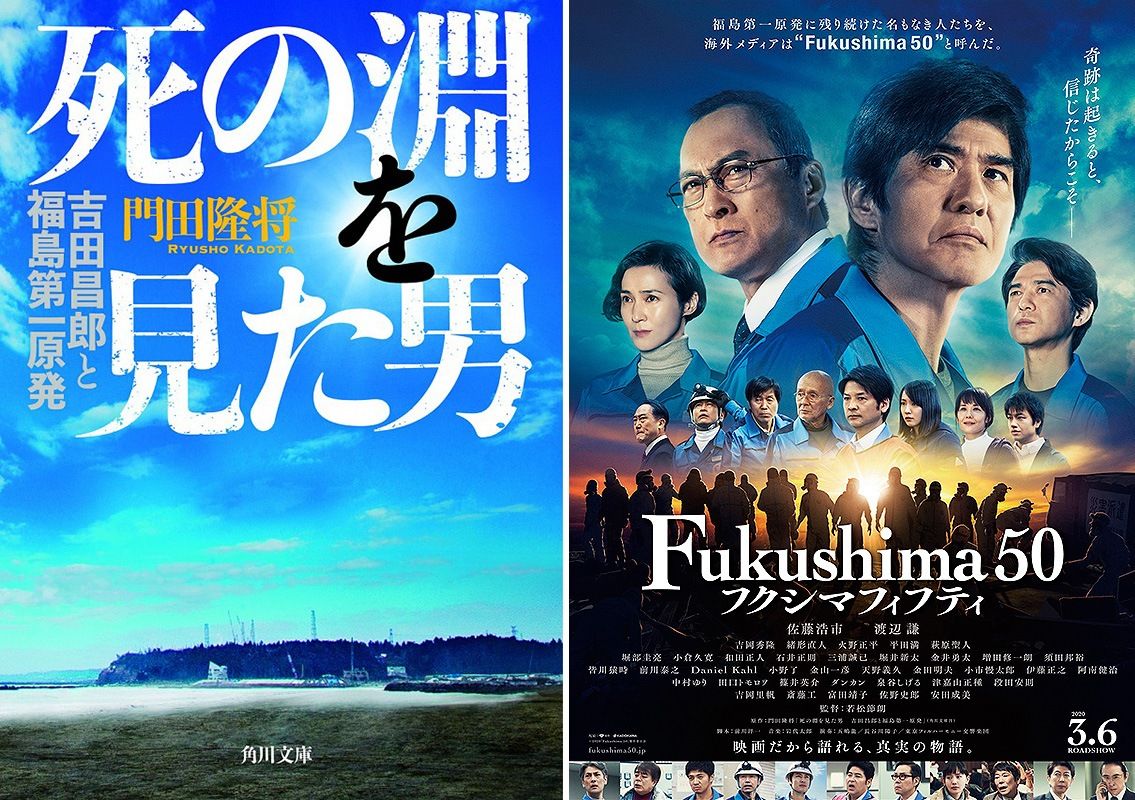 À gauche : « Celui qui a vu le gouffre de la mort – Yoshida Masao et la centrale Fukushima Daiichi » (Shi no fuchi wo mita otoko – Yoshida Masao to Fukushima Daiichi genpatsu). À droite : l’affiche du film Fukushima 50, réalisé par Wakamatsu Setsurô et distribué par Shochiku/Kadokawa.