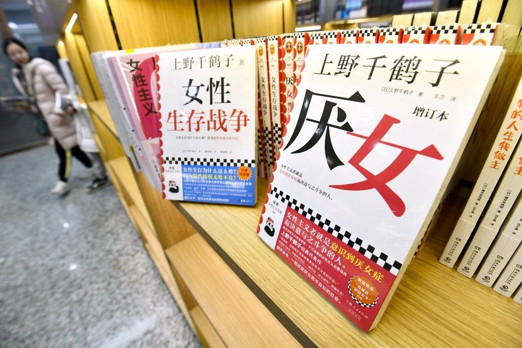 Les livres de Ueno Chizuko à la vente en traduction chinoise dans une librairie de Pékin. (Février 2024/ Kyodo).